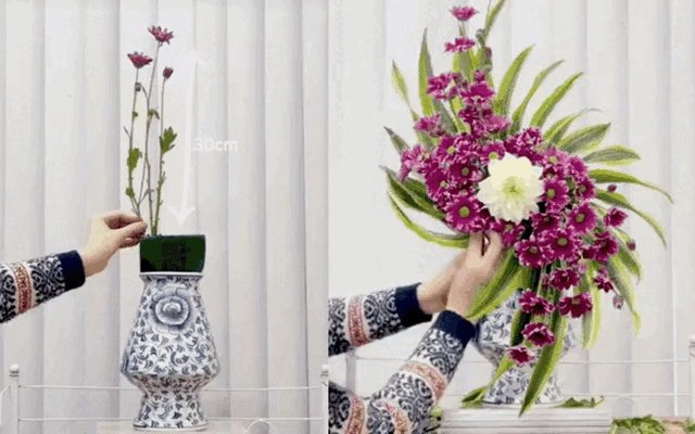 Hai cách cắm này sẽ giúp tạo ra 1 bình hoa cỡ lớn dù số lượng hoa không nhiều, trông sang trọng và trang nghiêm, thích hợp để bày trên bàn thờ vào dịp Tết.