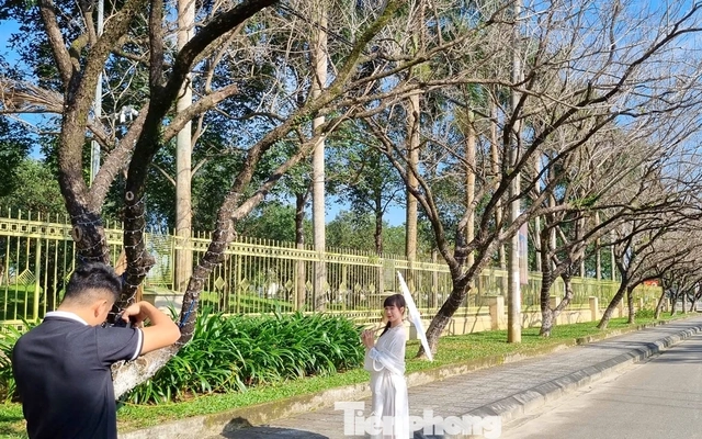 Nếu như vào mùa hạ, tuyến đường này vàng rực hoa sưa thì nay khi cây trụi lá vẫn có sức hấp dẫn riêng với bạn trẻ