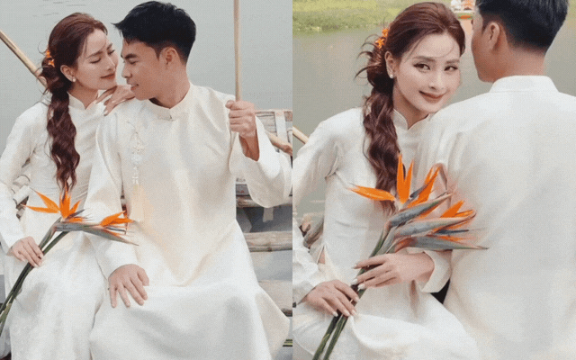 Trong bộ ảnh, MC Huyền Trang diện áo dài trắng tinh khôi, kiểu dáng truyền thống nhưng được xử lý tinh tế, tôn lên vẻ dịu dàng, nền nã. Kiểu tóc tết mềm mại, lớp trang điểm trong veo càng làm nổi bật thần thái nữ tính, đúng chuẩn "nàng thơ". Bên cạnh đó, ông xã cô - tuyển thủ Đức Huy - xuất hiện trong áo dài đồng điệu, giản dị nhưng vững chãi, tạo nên tổng thể hài hòa và rất tình.