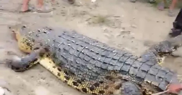 Đoạn clip ghi lại cho thấy con cá sấu dài 5,8 mét đang vùng vẫy dữ dội trong dòng sông Luan Boya, Indonesia, đục ngầu, trong khi những người chứng kiến lo lắng la hét.