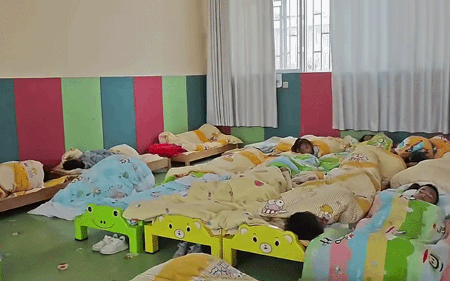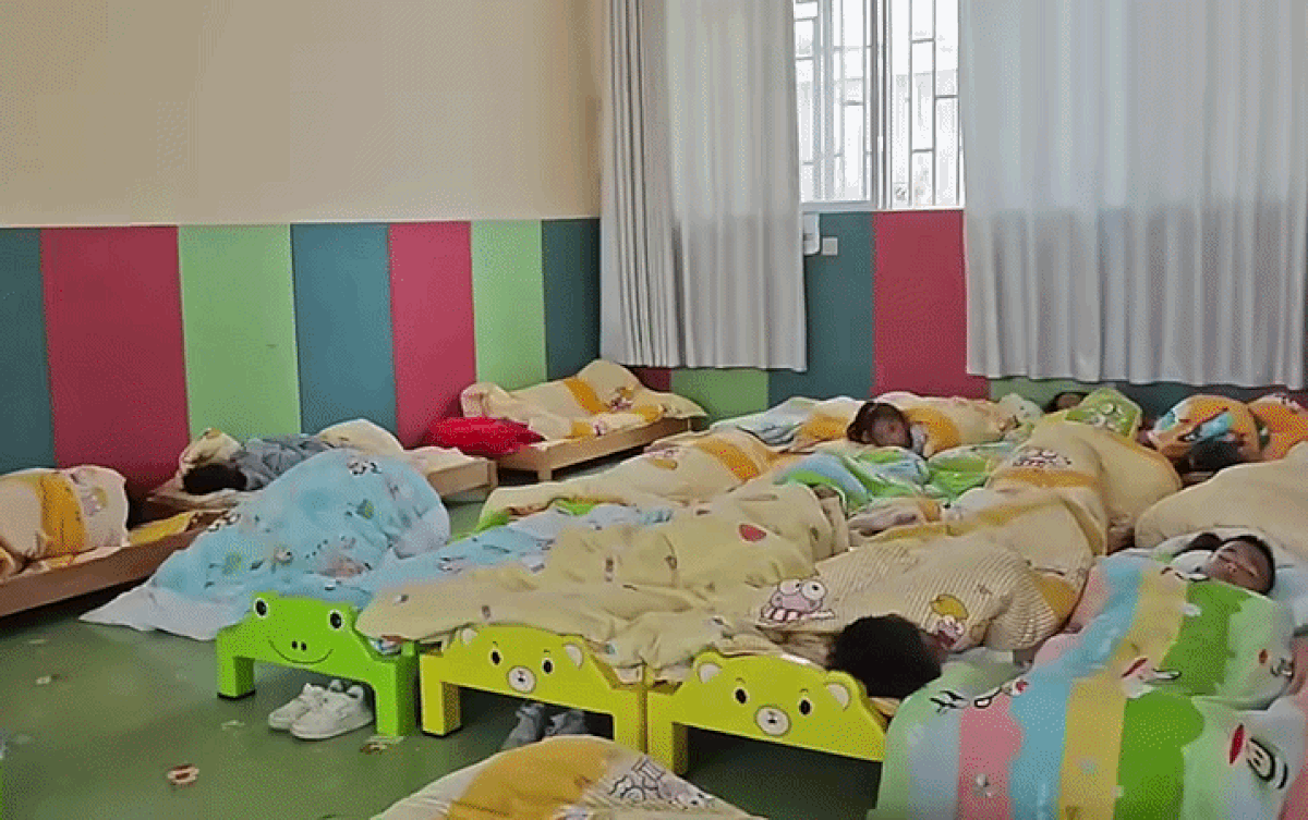 Đoạn video bắt đầu bằng quang cảnh cực kỳ bình yên của phòng ngủ tập thể tại trường. Hàng chục chiếc giường nhỏ được xếp ngay ngắn, các bạn nhỏ đang chìm vào giấc nồng một cách ngoan ngoãn. Ánh sáng trong phòng được điều chỉnh vừa phải, không gian yên tĩnh đến mức chỉ nghe thấy tiếng thở đều đều của các con. Cô giáo cũng đang tất bật kiểm tra, đắp chăn cho từng bạn. Nhìn khung cảnh này, ai cũng nghĩ: "Ôi ngoan quá, gửi con đi học đúng là quyết định sáng suốt".