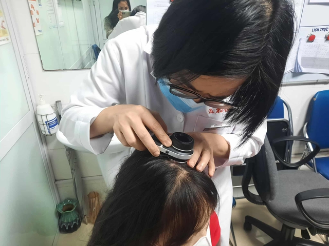 Trường hợp bệnh nhân rụng tóc đang được bác sĩ thăm khám (ảnh: N.M).
