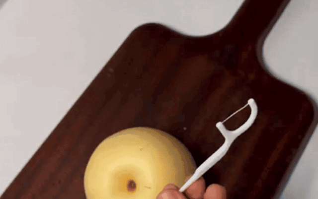 Trong trường hợp không có dụng cụ gọt hoa quả thì chỉ nha khoa chính là "vị cứu tinh". Bạn có thể dùng đầu nhọn của sợi chỉ để rạch nhẹ lớp vỏ trái cây, rồi xoay quanh quả để gọt vỏ ra. Với những loại quả như kiwi, lê, táo... việc gọt vỏ bằng chỉ nha khoa sẽ khá nhanh chóng, sạch sẽ, hoàn toàn không sợ dập tay hay làm nát quả. Ngay cả nhãn hay dưa hấu nhỏ, chỉ nha khoa cũng có thể giúp tách vỏ hay chia phần gọn gàng, giữ nguyên vẹn thịt quả, cực tiện lợi trong trường hợp không có dao/kéo để sử dụng.