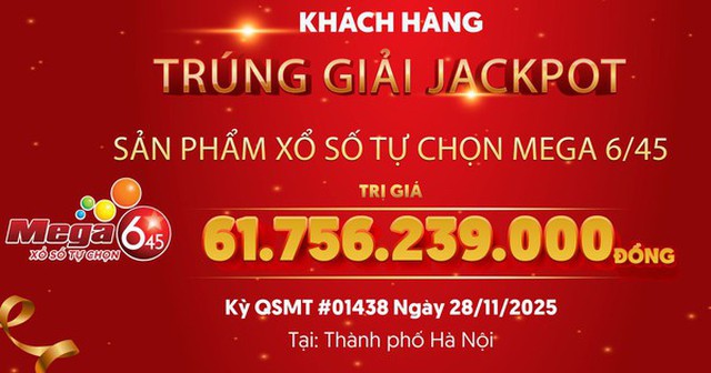 Theo thông tin từ fanpage của Công ty Xổ số Điện toán Việt Nam (Vietlott), kỳ quay số mở thưởng ngày 28/11/2025 của sản phẩm Mega 6/45 đã xác định một khách hàng tại Hà Nội trúng giải Jackpot trị giá 61.756.239.000 đồng.