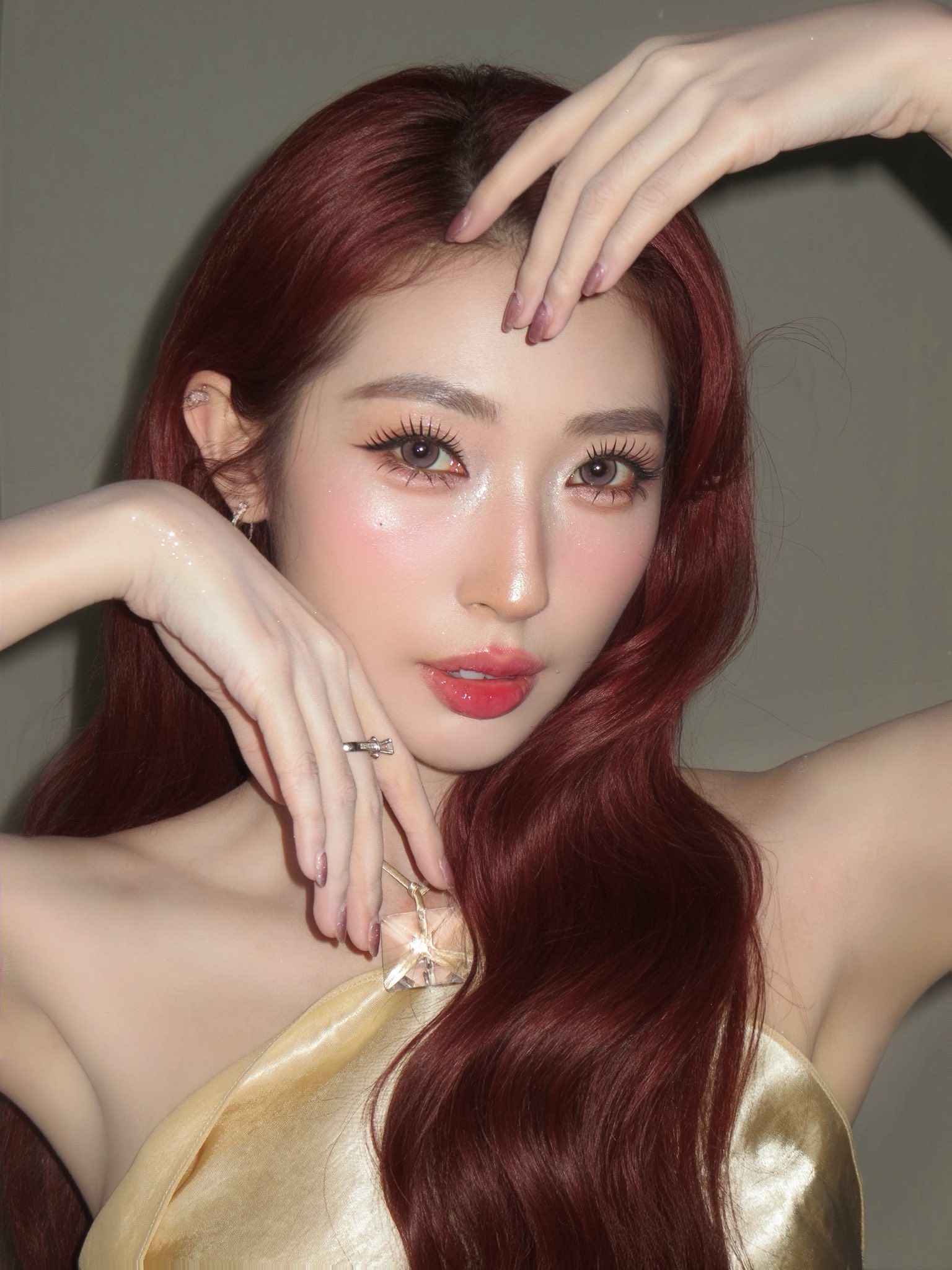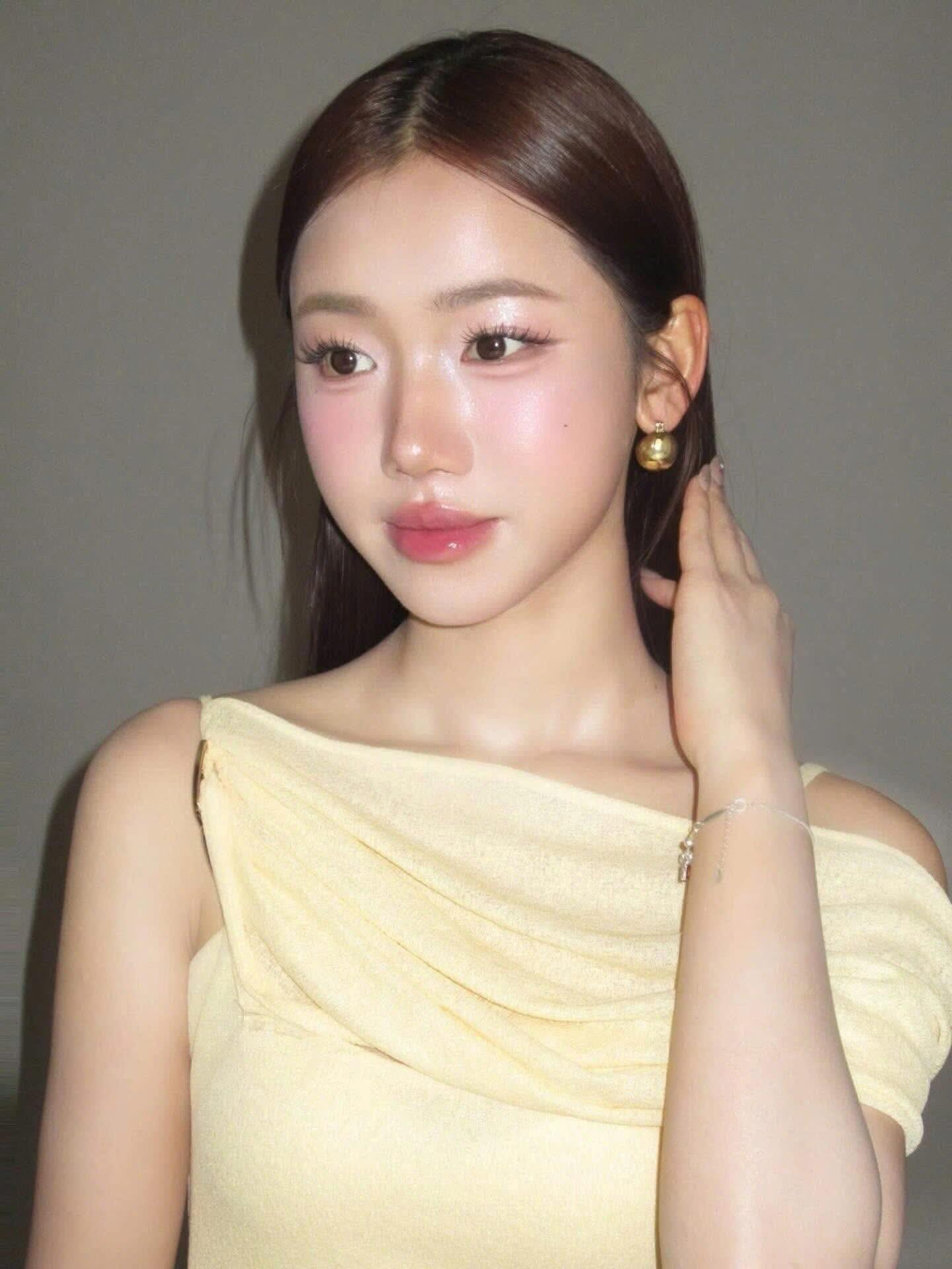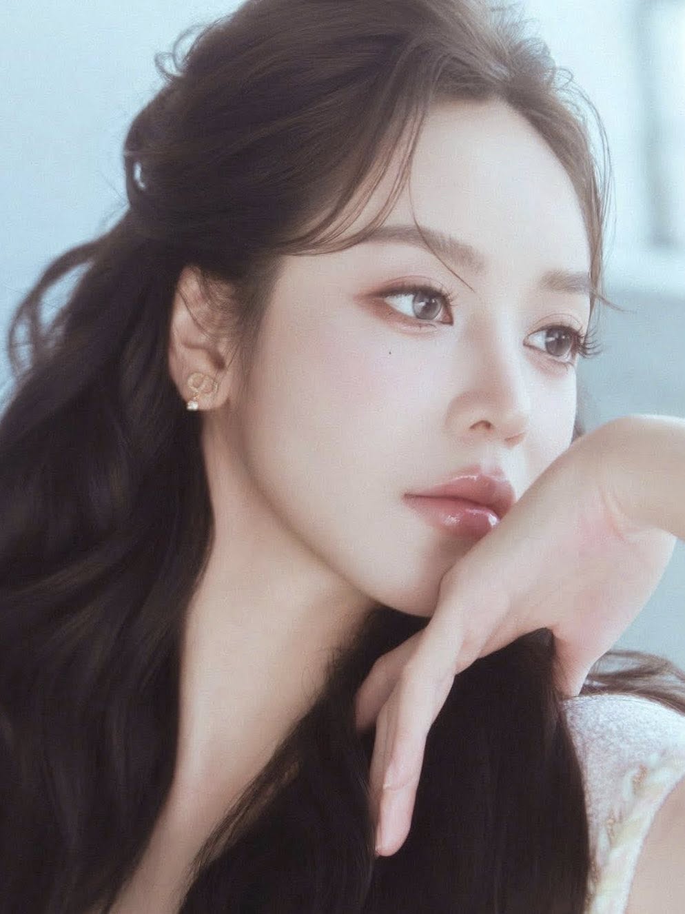 Không đơn thuần là một lớp makeup ngọt ngào dễ thương, tông hồng mà Hiwon theo đuổi là một dạng "romantic glam" được xử lý khá kỹ về ánh sáng và sắc độ. Lớp nền mỏng, căng bóng theo hướng glass skin giúp da phản sáng tốt, kết hợp cùng má hồng đặt cao ở gò má và lan nhẹ lên vùng thái dương, tạo hiệu ứng flush tự nhiên như da ửng hồng từ bên trong. Điểm đáng chú ý là phần highlight được tiết chế vừa đủ nhưng đặt đúng vị trí sống mũi, đầu mắt, gò má giúp gương mặt bắt sáng khi lên hình mà không bị lộ texture.