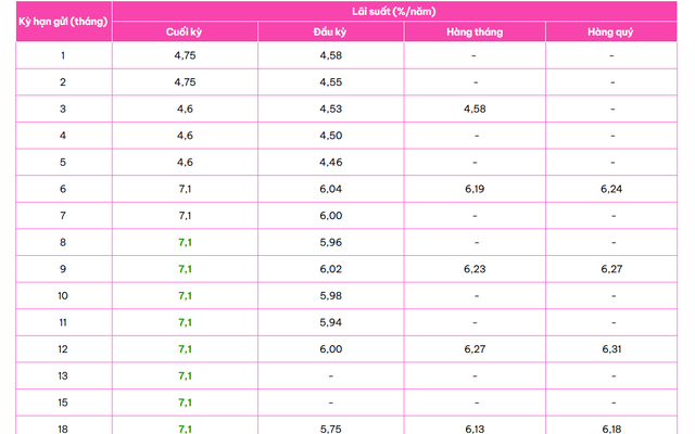 Cụ thể, khách hàng gửi từ 1 tỷ đồng trở lên ở kỳ hạn 6 tháng sẽ được cộng thêm 1%/năm so với lãi suất niêm yết. Với mức lãi suất niêm yết hiện hành là 7,1%/năm, tổng lãi suất thực nhận theo hình thức lĩnh lãi cuối kỳ có thể đạt 7,3 - 8,1%/năm – cao nhất trên thị trường hiện nay ở kỳ hạn 6 tháng.