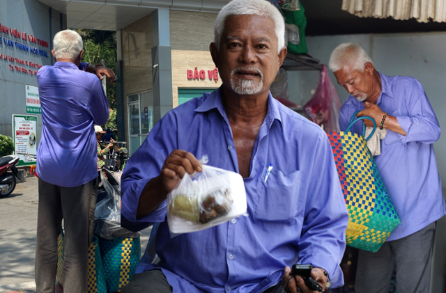 “Chú đi bộ từng phòng, từ khoa này qua khoa khác nên đổ nhiều mồ hôi lắm. Khi nào mệt thì tấp vô hàng ghế ngồi nghỉ, vài phút rồi lại đi tiếp. Làm lẹ để qua phòng khác chứ trễ giờ người ta uống thuốc, người ta tưởng mình không đến lại đi mua thì tốn tiền. Trung bình giỏ đồ cũng hai mấy, ba chục ký.”