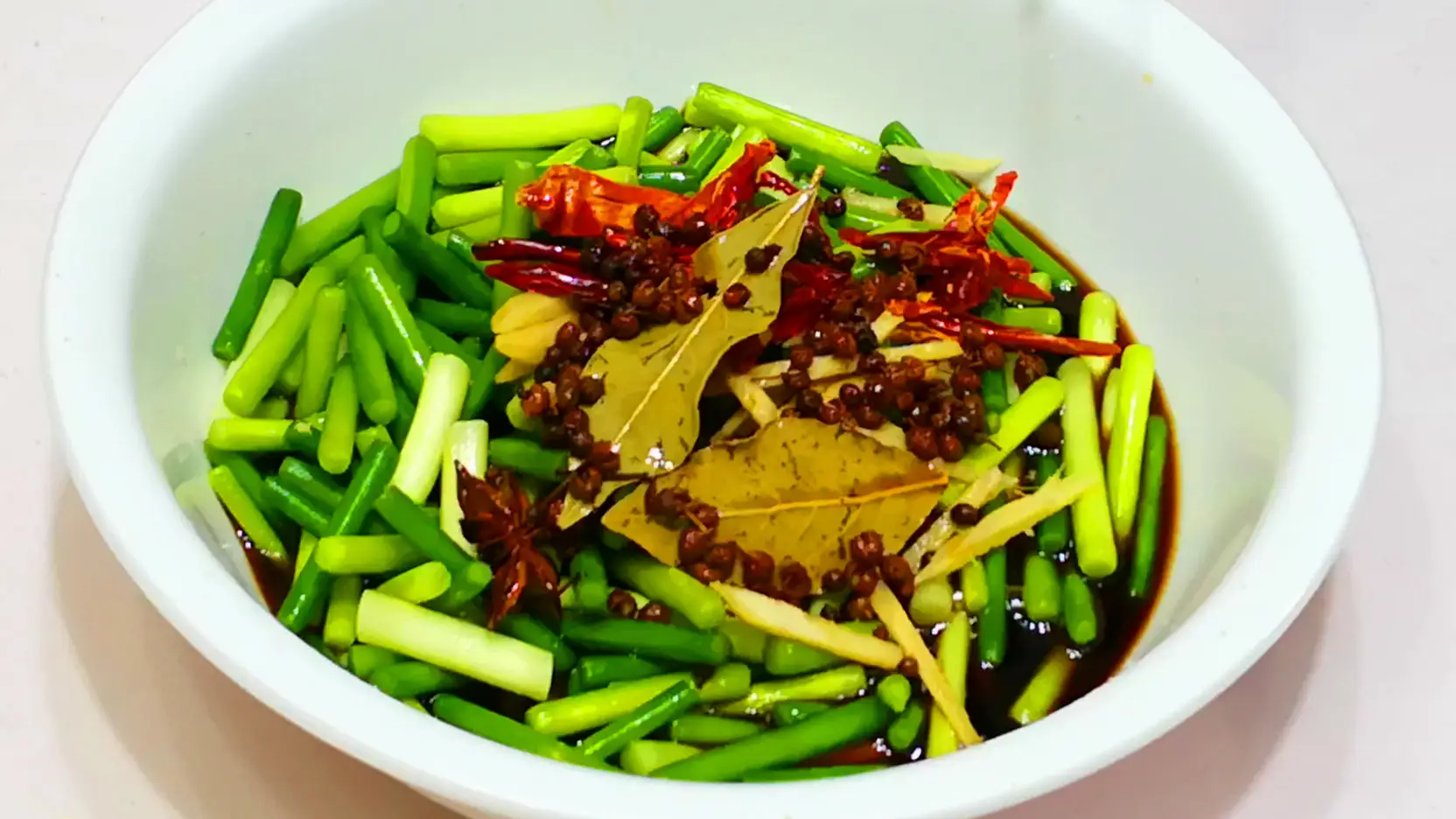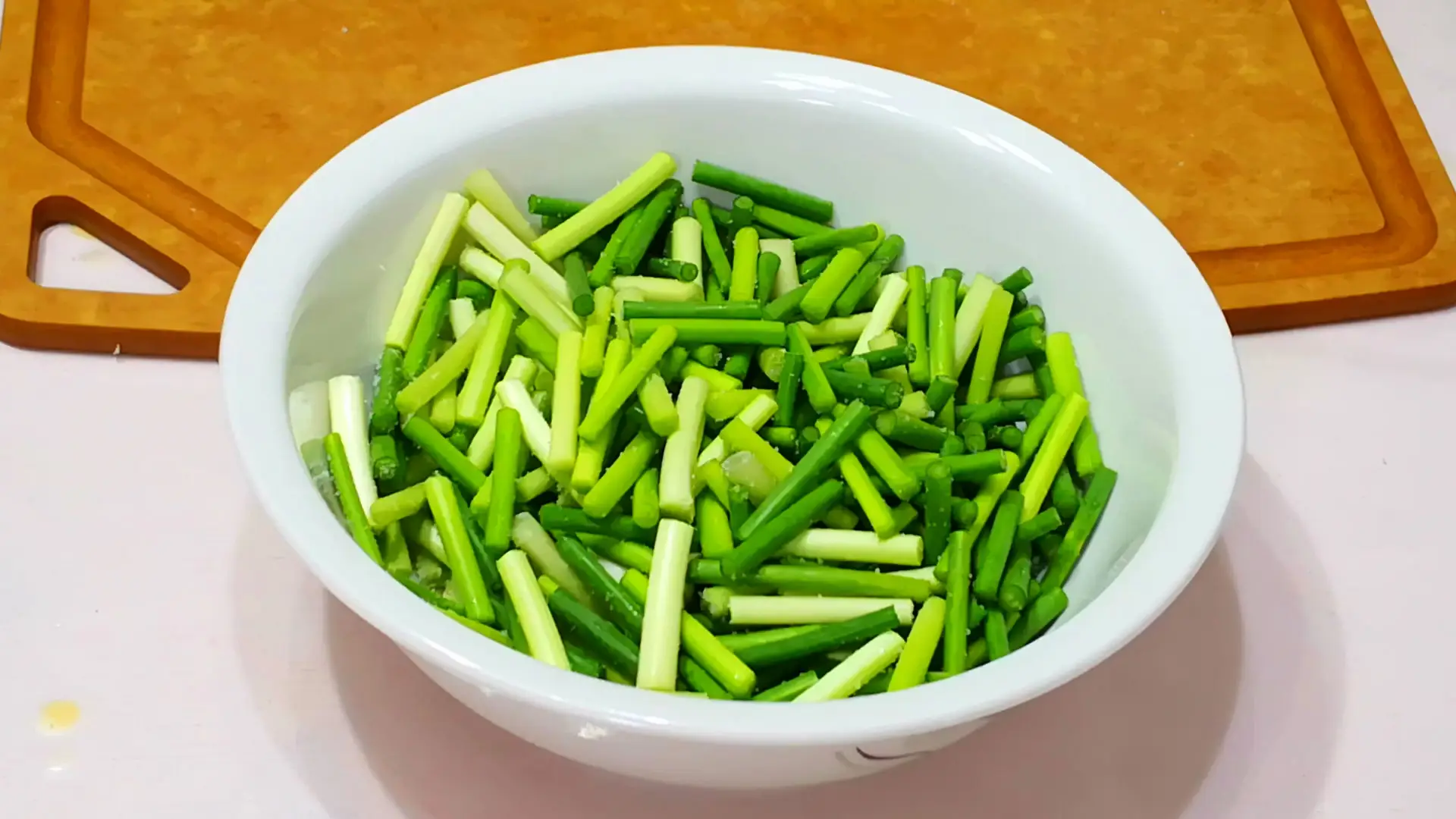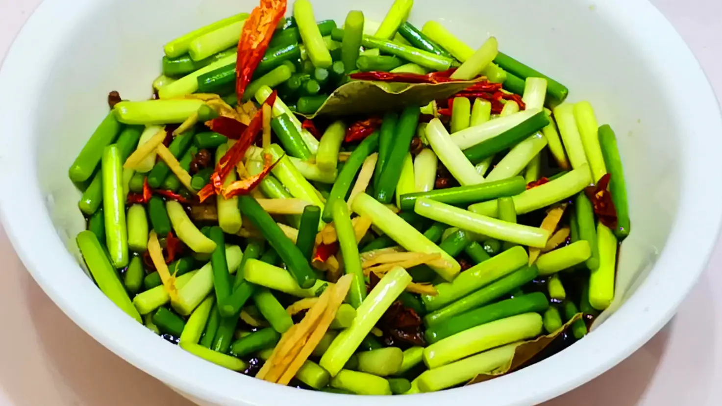 Sơ chế: Chọn ngồng tỏi non, bỏ phần đầu và đuôi già. Rửa sạch, để ráo nước rồi cắt đoạn 2-3cm. Cho vào bát, trộn đều với muối và để ngâm khoảng 3 tiếng. Việc này giúp rút bớt nước để ngồng tỏi giòn hơn và giảm vị hăng cay.