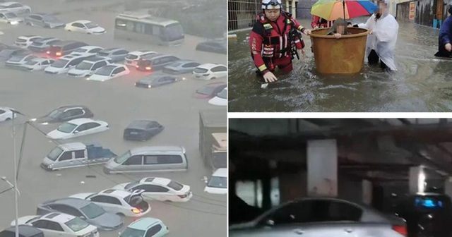 Ngập lụt nghiêm trọng trên diện rộng, nước lũ tràn vào hầm gửi xe. Ảnh: HK01