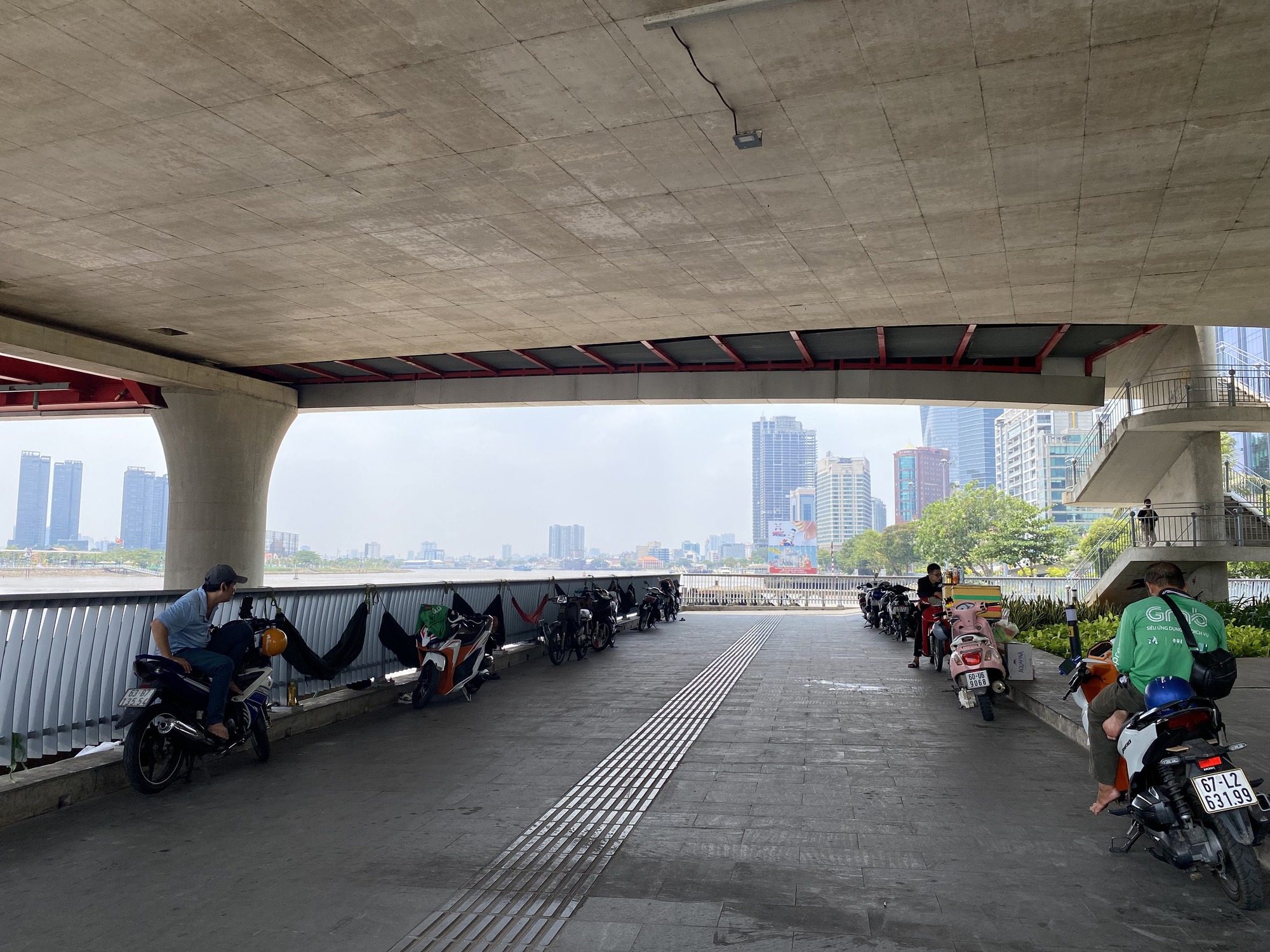 Ở khu vực cầu Thủ Thiêm (TP Thủ Đức), tài xế công nghệ tập trung đông theo tốp mắc võng nghỉ trưa. Đa phần, họ chuẩn bị sẵn cơm hộp, nằm nói chuyện ở không gian dạ cầu, trồng nhiều cây xanh. Lâu lâu, gió từ lòng sông thổi vào mát rười rượi.