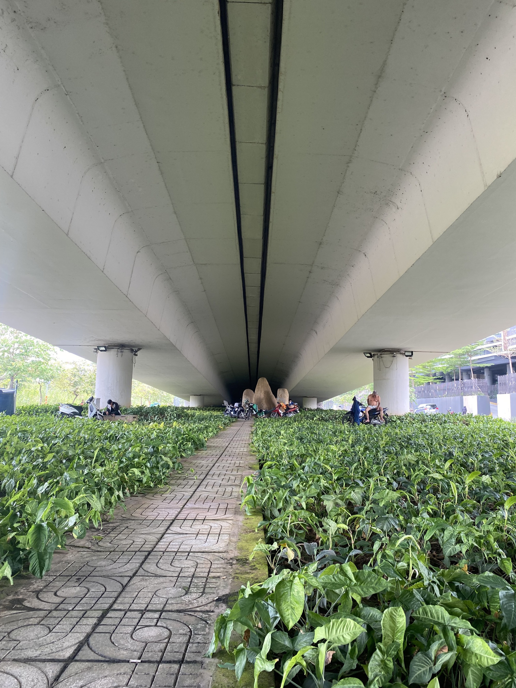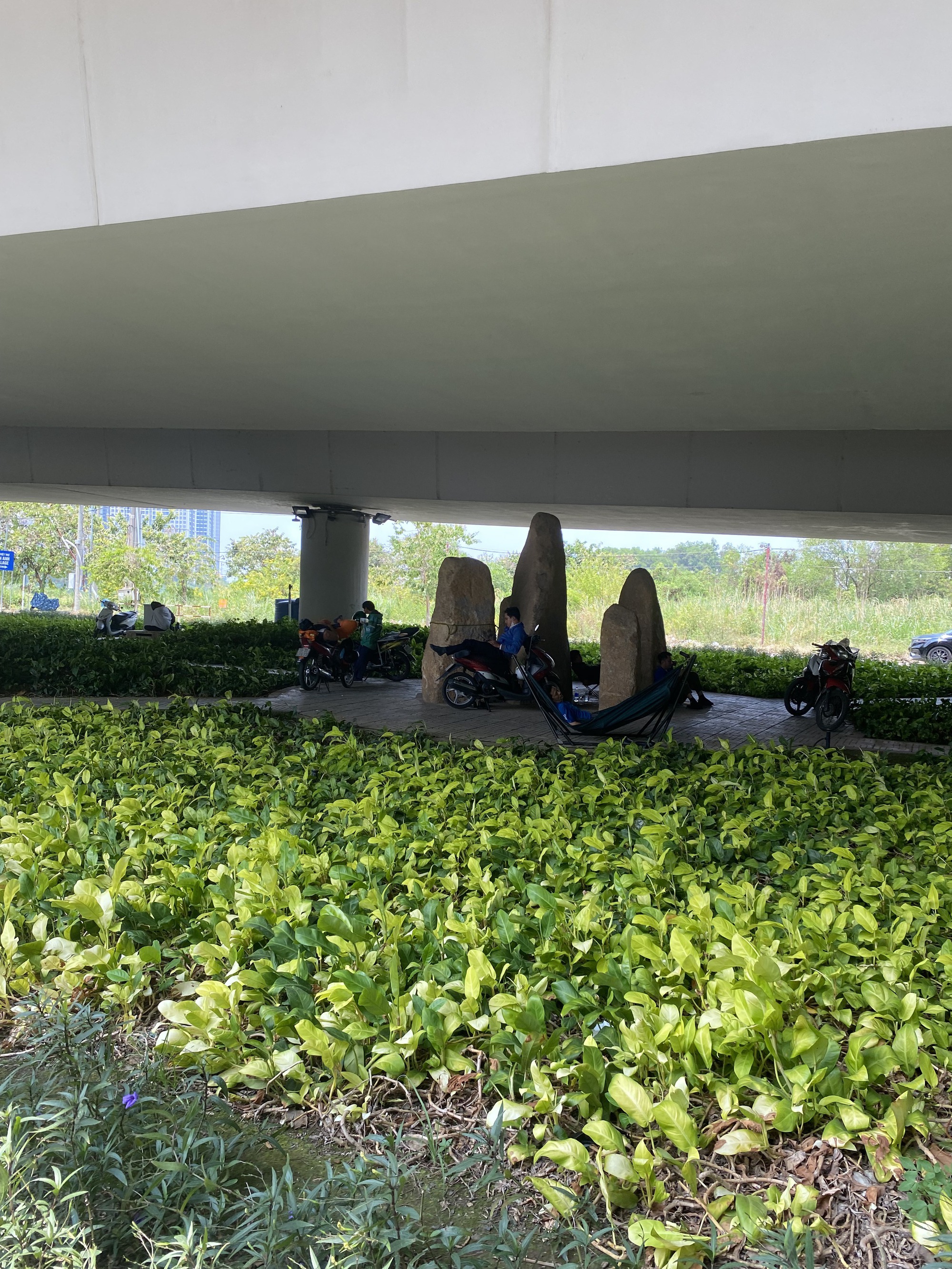 Một tài xế nói vui: “Trời nóng tới mức không ai mặc nổi quần dài luôn”. Anh nói lương tài xế không bao nhiêu mà phải nuôi vợ con ở nhà, nên không dám tiêu xài mạnh tay. Họ đều chạy xe ô tô thuê cho những người sống trong chung cư cạnh cầu Thủ Thiêm. Anh em trưa lại rủ nhau ra gầm nằm ngủ, vừa đỡ tốn tiền, vừa có người trò chuyện. Gần đó, vài hộ dân cũng không chịu nổi cái nóng khi ở nhà, ra đây tản bộ.