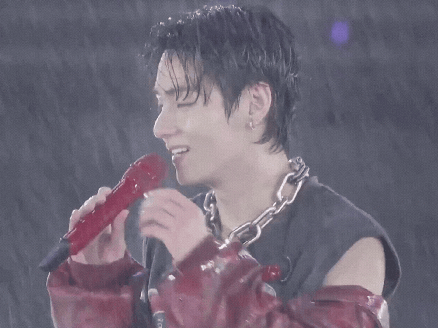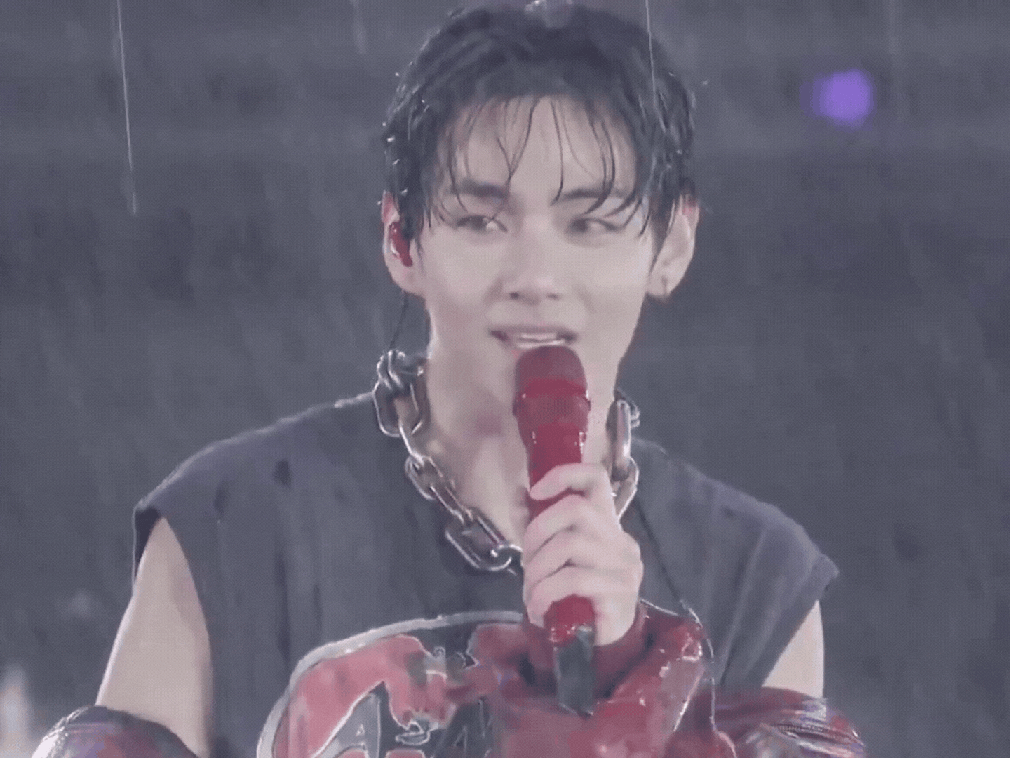 Dưới cơn mưa nặng hạt tối qua, ngoại hình của V không hề bị ảnh hưởng mà ngược lại còn trở nên nổi bật và cuốn hút hơn. Xuyên suốt đêm diễn, nam thần tượng biến hóa linh hoạt với nhiều phong cách thời trang khác nhau. Khi diện trang phục da đen cá tính, mái tóc ướt sũng rủ xuống trán càng làm tôn lên những đường nét sắc sảo, nam tính trên gương mặt. Dù mặt sàn sân khấu trơn trượt và thời tiết se lạnh, anh vẫn giữ vững thần thái chuyên nghiệp, liên tục tương tác nhiệt tình với khán giả.
