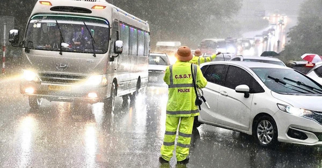 Lực lượng chức năng đội mưa điều tiết giao thông (Ảnh: Bộ Công an)