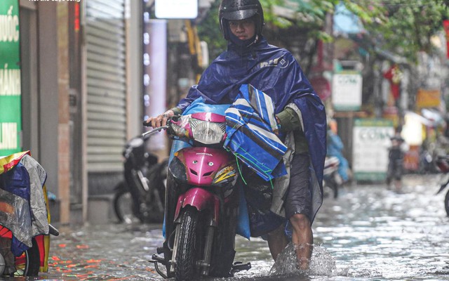 “Bình thường về nhà chỉ mất 20 phút, hôm nay tôi đi hơn một tiếng vẫn chưa thoát ra khỏi phố Triều Khúc. Nước ngập sâu, xe chết máy giữa đường, tôi phải dắt bộ cả đoạn dài. Trời mưa to lại tối nhanh, vừa lạnh vừa lo bị ngã”, anh Khổng Văn Chí, ở quận Nam Từ Liêm chia sẻ.