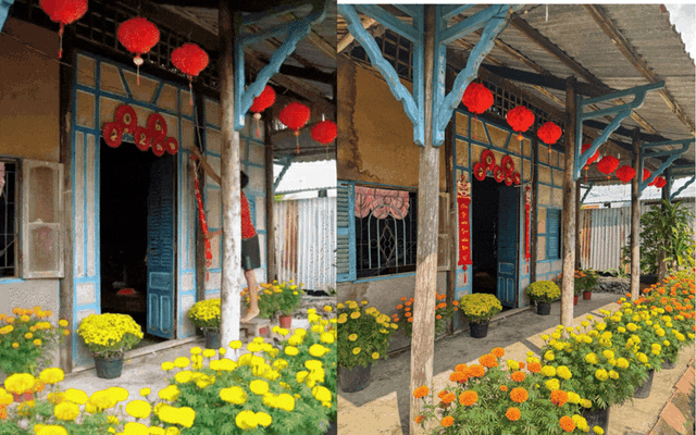 Căn nhà cấp 4 đơn sơ, mang đậm nét văn hóa của người miền Tây, như được khoác lên mình một tấm áo mới. Sắc đỏ rực rỡ của những chiếc đèn lồng Tết treo trước hiên nhà, hòa cùng sắc vàng tươi tắn của hoa cúc, hoa mai khiến không gian trở nên bừng sáng.
