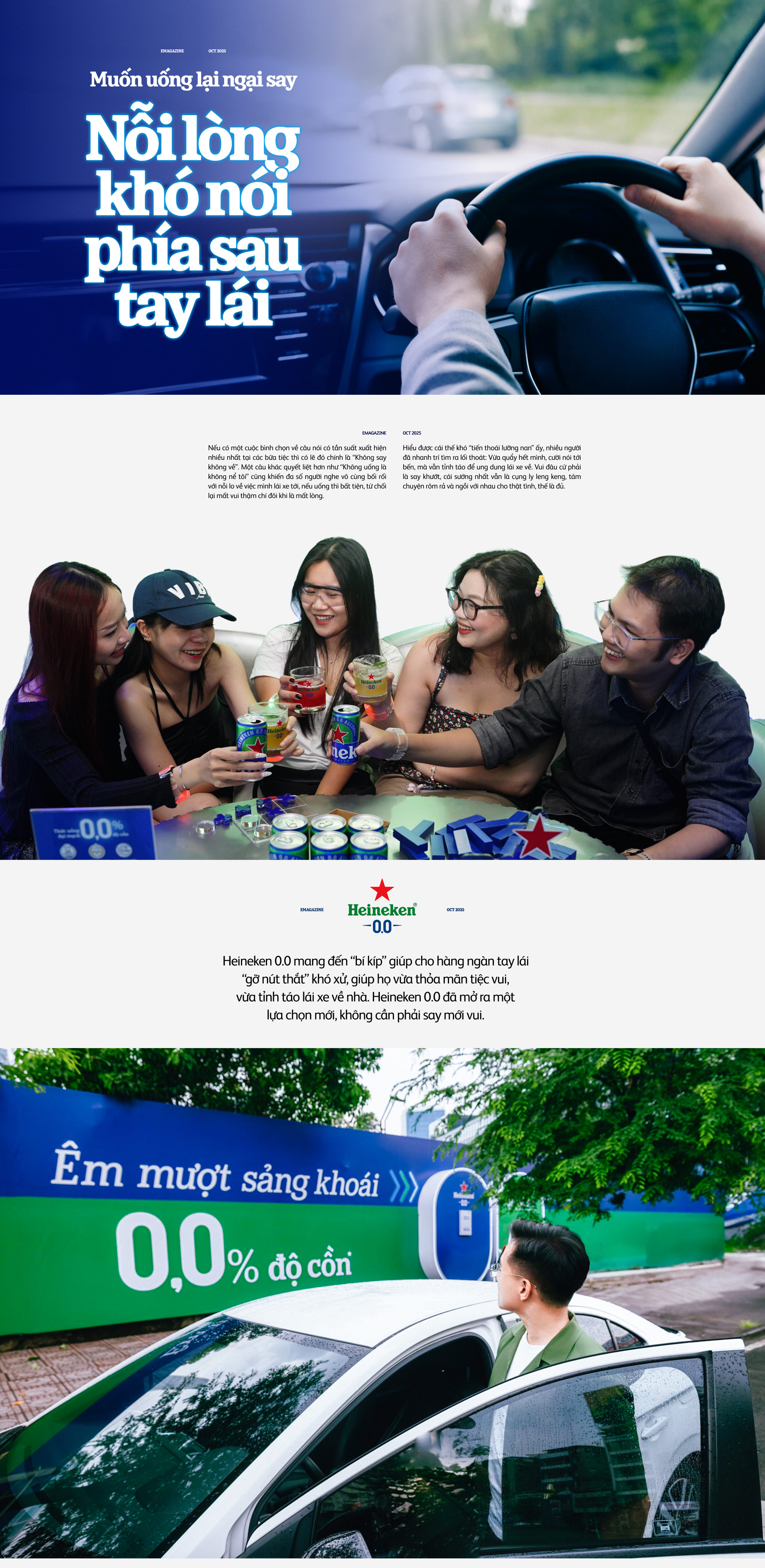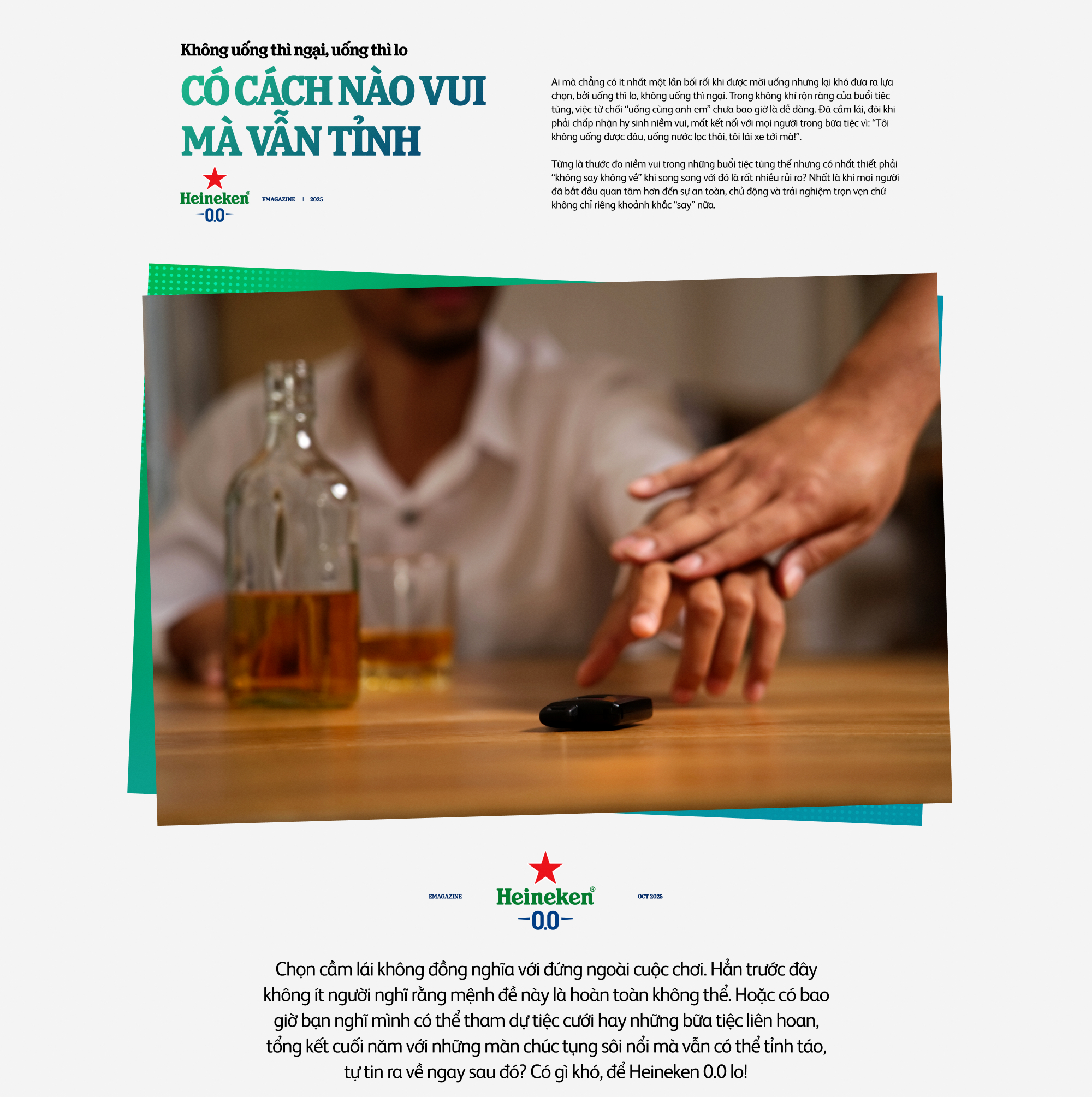 Câu chuyện đó là của Nam - một anh chàng với tính cách hướng ngoại, sôi nổi ở công ty. Hôm đấy là liên hoan mừng dự án thành công, sếp thân thiện cầm ly bước tới: "Nào Nam, một chén mở màn cho anh em nào". Mấy chục ánh mắt nhìn vào, Nam vẫn vui vẻ thoải mái nâng ly, nhập cuộc vui vẻ với Heineken 0.0.