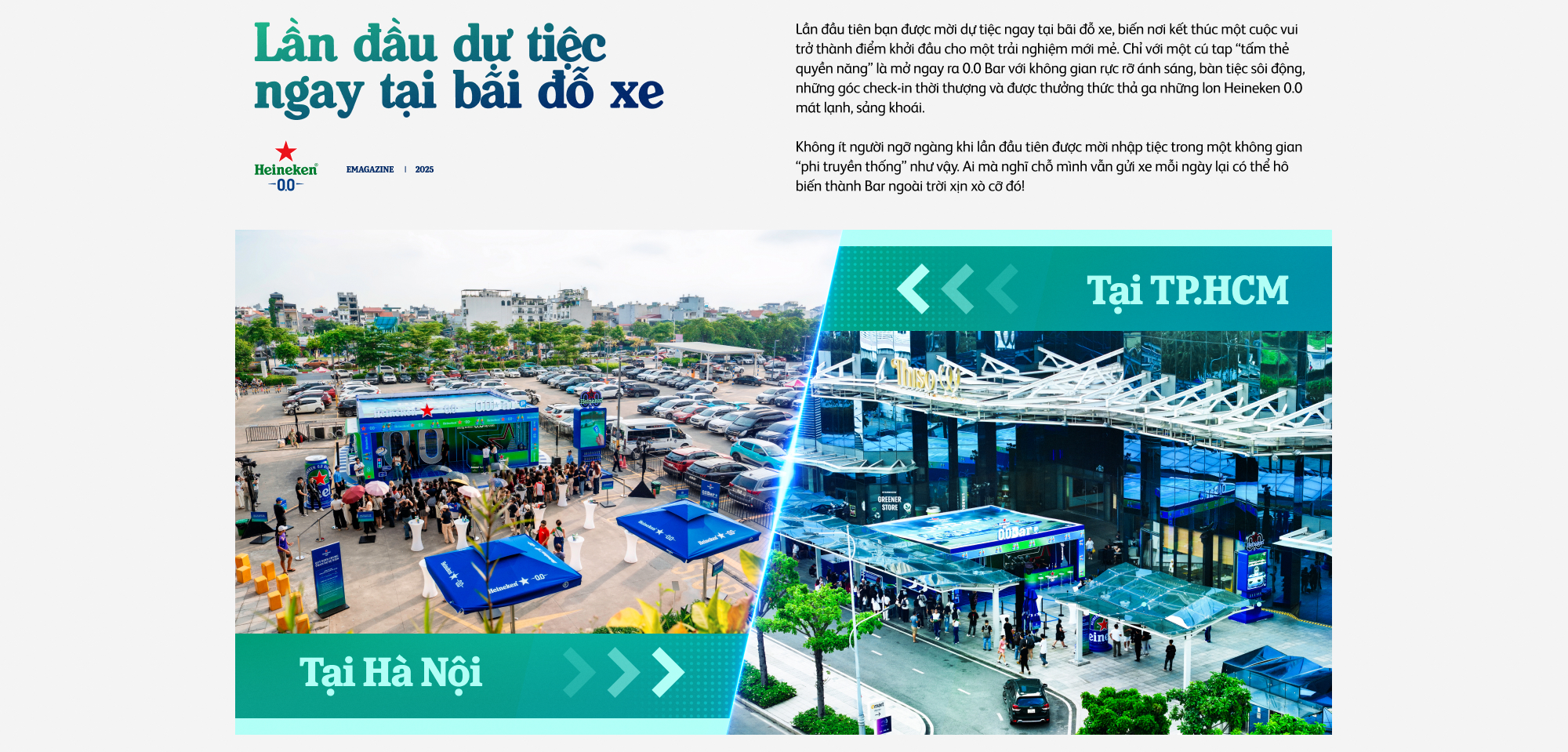 Để thay đổi nhận thức về việc không chỉ say mới là biết cách tận hưởng ấy, Heineken 0.0 đã mang "0.0 Bar - Chuỗi tiệc sảng khoái dành cho mọi tay lái" đến với hai thành phố lớn là TP. HCM và Hà Nội để mở ra một lựa chọn mới, an toàn nhưng không kém phần hứng khởi.