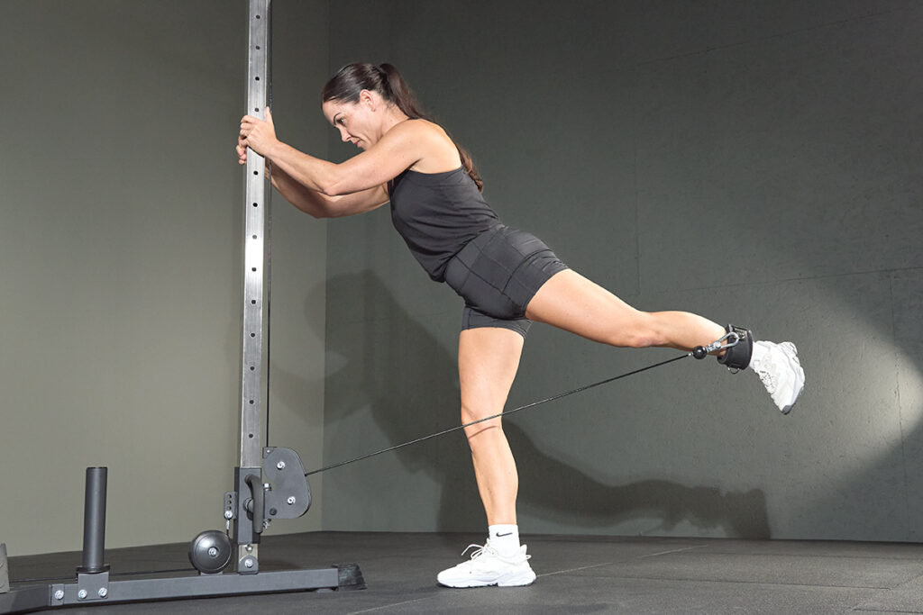 Cách thực hiện: Sử dụng dây kháng lực (miniband) hoặc máy cáp. Đá chân ra sau hoặc chéo nhẹ sang bên. Giữ hông cố định, không dùng đà của lưng để đá chân.
