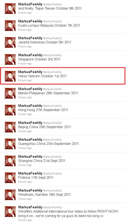 Chiều tối hôm qua 17/7, thành viên Mark Feehily đã update trước cho fan thông tin chi tiết về tour diễn quốc tế của Westlife trên Twitter của mình. Mặc dù website chính thức của Westlife chưa hề đăng tải những ngày lưu diễn mới tại Châu Á này, tuy nhiên các fan đã gần như chắc nịch về những thông tin Mark chia sẻ trên Twitter.