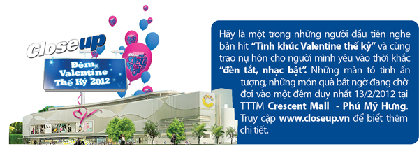 Đêm Valentine Thế kỷ năm nay, tại tầng thượng tòa nhà Crescent Mall (Phú Mỹ Hưng, Q.7, TP.HCM), trong không gian tràn ngập những sắc màu lung linh, 100 cặp tình nhân nổi tiếng của làng Showbiz Việt cùng các khách mời, sẽ cùng nhau chia sẻ thời khắc lãng mạn ngọt ngào, cùng tham gia những trò chơi thú vị như Kiss Out Loud hay Love Out Loud với những phần thưởng hấp dẫn dành cho: nụ hôn đẹp nhất, nụ hôn ấn tượng nhất và nụ hôn hài hước nhất…