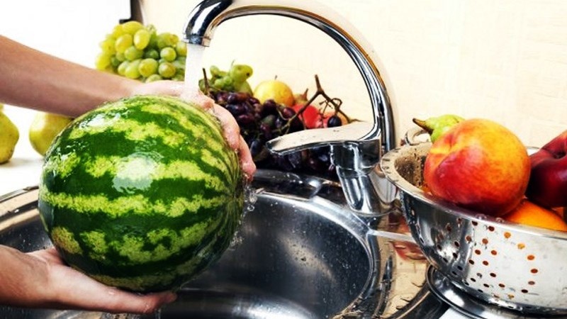 Mẹo nhỏ: Hãy rửa dưới vòi nước chảy, với dứa hoặc dưa lưới có vỏ nhám, nên dùng bàn chải chuyên dụng cọ nhẹ để loại bỏ hoàn toàn các chất bẩn bám trong khe kẽ.