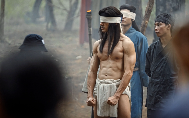 Trong ảnh, Lương Thế Thành trong tạo hình của nhân vật Lỗ Đạt, bị che kín mắt và để lộ thân hình không chút mỡ thừa, cơ bắp cuồn cuộn.