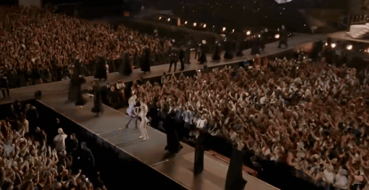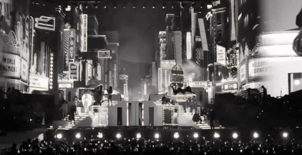 Mở màn với Vogue , không gian sân khấu và luồng phát sóng bị phủ một lớp filter trắng đen nhuốm màu điện ảnh Hollywood cổ điển. Bố cục dàn dựng mô phỏng đại lộ Broadway sầm uất với các biển hiệu neon khổng lồ nhấp nháy liên tục. Bối cảnh hoành tráng này làm nền cho màn đọ dáng cực nét của hai biểu tượng nhạc Pop trên hệ thống cầu thang đồ sộ, tái hiện những động tác vogueing kinh điển.