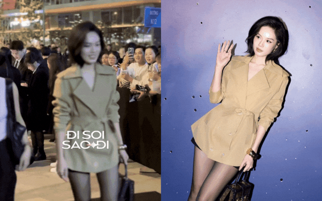 Trâm Anh ghi dấu ấn với hình ảnh sang trọng và thanh lịch, đúng chuẩn tinh thần của một bữa tiệc thời trang cao cấp. Mỹ nhân sinh năm 1995 lựa chọn chiếc trench coat dáng ngắn tông beige trung tính, phom dáng gọn gàng với chi tiết thắt eo khéo léo, vừa tôn vóc dáng thon gọn vừa mang lại cảm giác hiện đại, tinh tế. Đi kèm là tất đen mỏng và giày cao gót mũi nhọn, tạo nên tổng thể tối giản nhưng đầy khí chất và "hack" đôi chân thêm nuột nà.