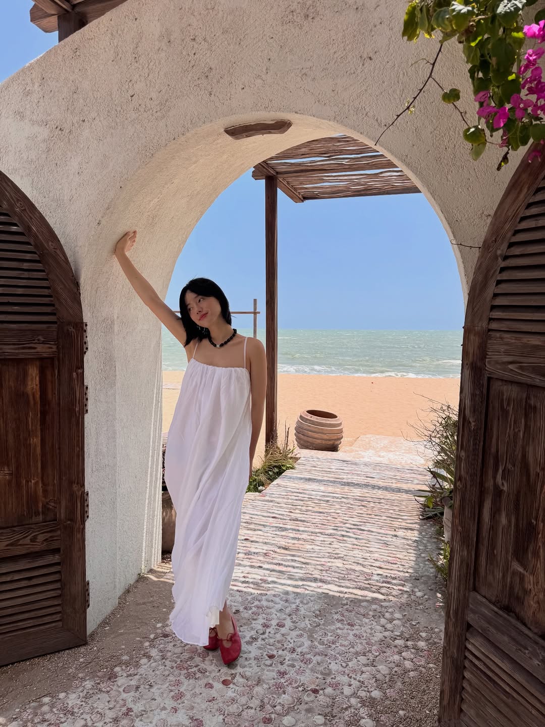 Check-in cảnh biển đẹp như tranh, Cô Em Trendy chọn diện váy trắng dáng suông rộng thướt tha, khéo mix cùng giày đỏ nổi bật. Sự tương phản màu sắc tạo điểm nhấn cuốn hút, giúp outfit tối giản trở nên yêu kiều hơn.