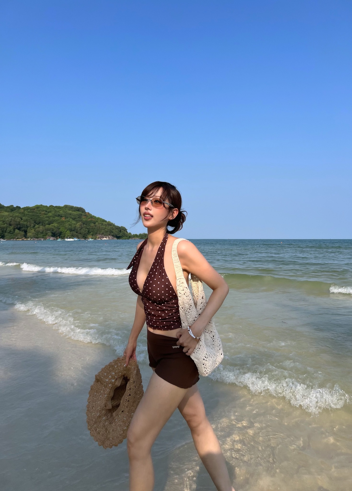 Vi vu biển, Min chọn set đồ vừa gợi cảm vừa kín đáo với áo cổ yếm và quần short ôm. Tông nâu trầm kết hợp họa tiết chấm bi giúp tổng thể hài hòa, tôn lên nét năng động, cuốn hút.