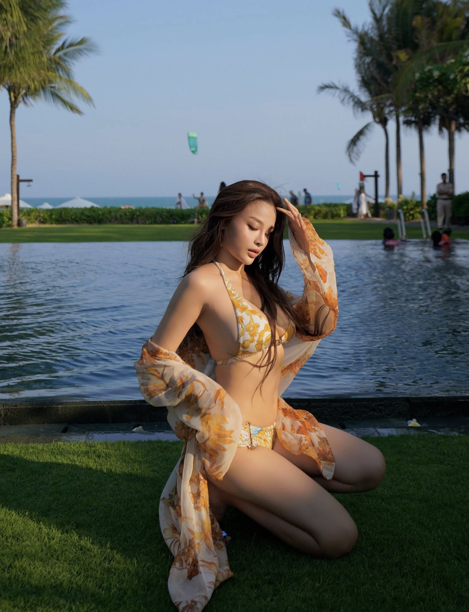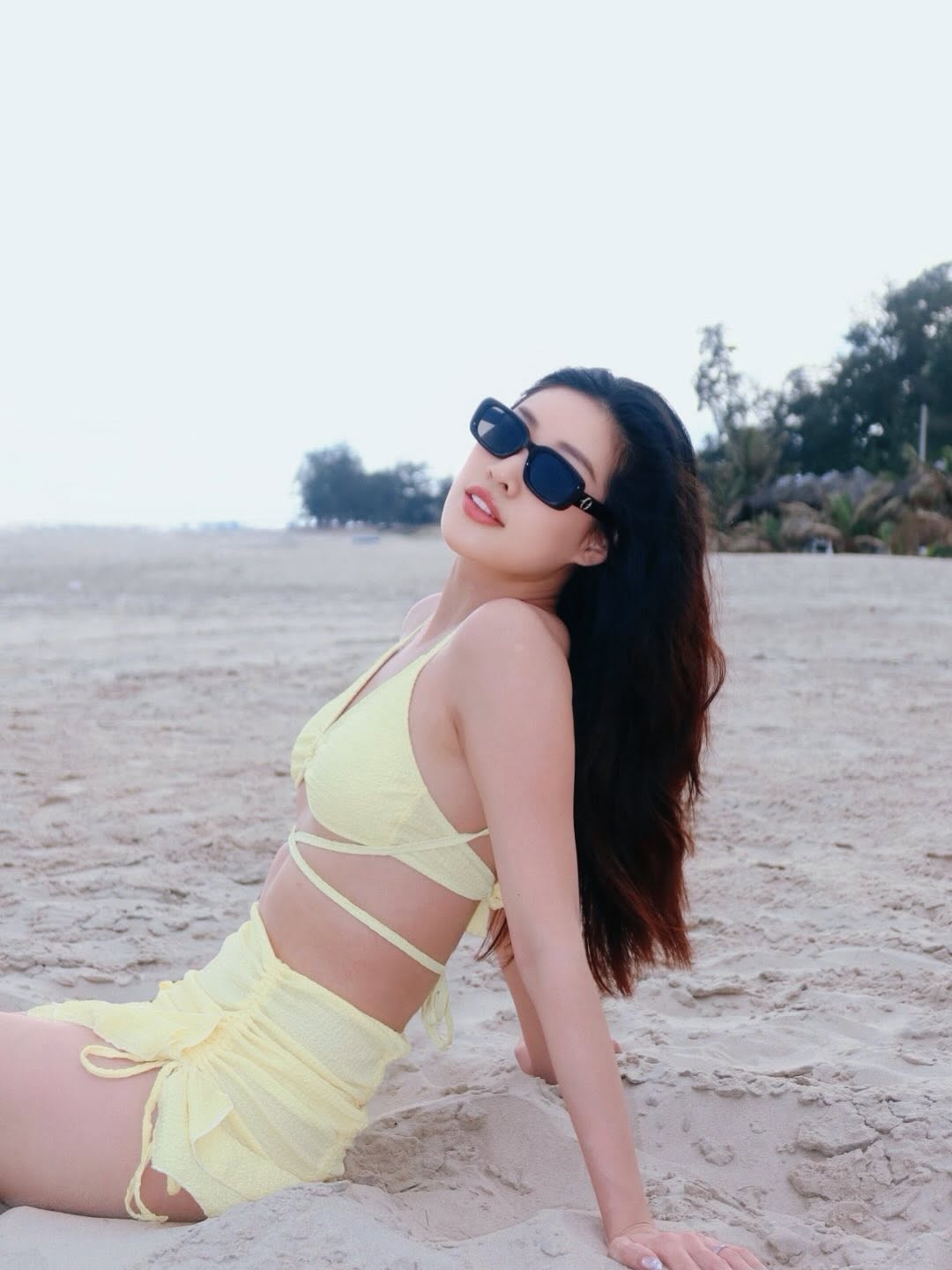 Khánh Vân đi biển chọn diện bikini màu vàng nổi bật, thiết kế dáng váy giúp tổng thể không quá gợi cảm nhưng vẫn giữ được nét quyến rũ, yêu kiều. Họa tiết dây tạo điểm nhấn mềm mại, tôn lên vẻ nữ tính và cuốn hút.
