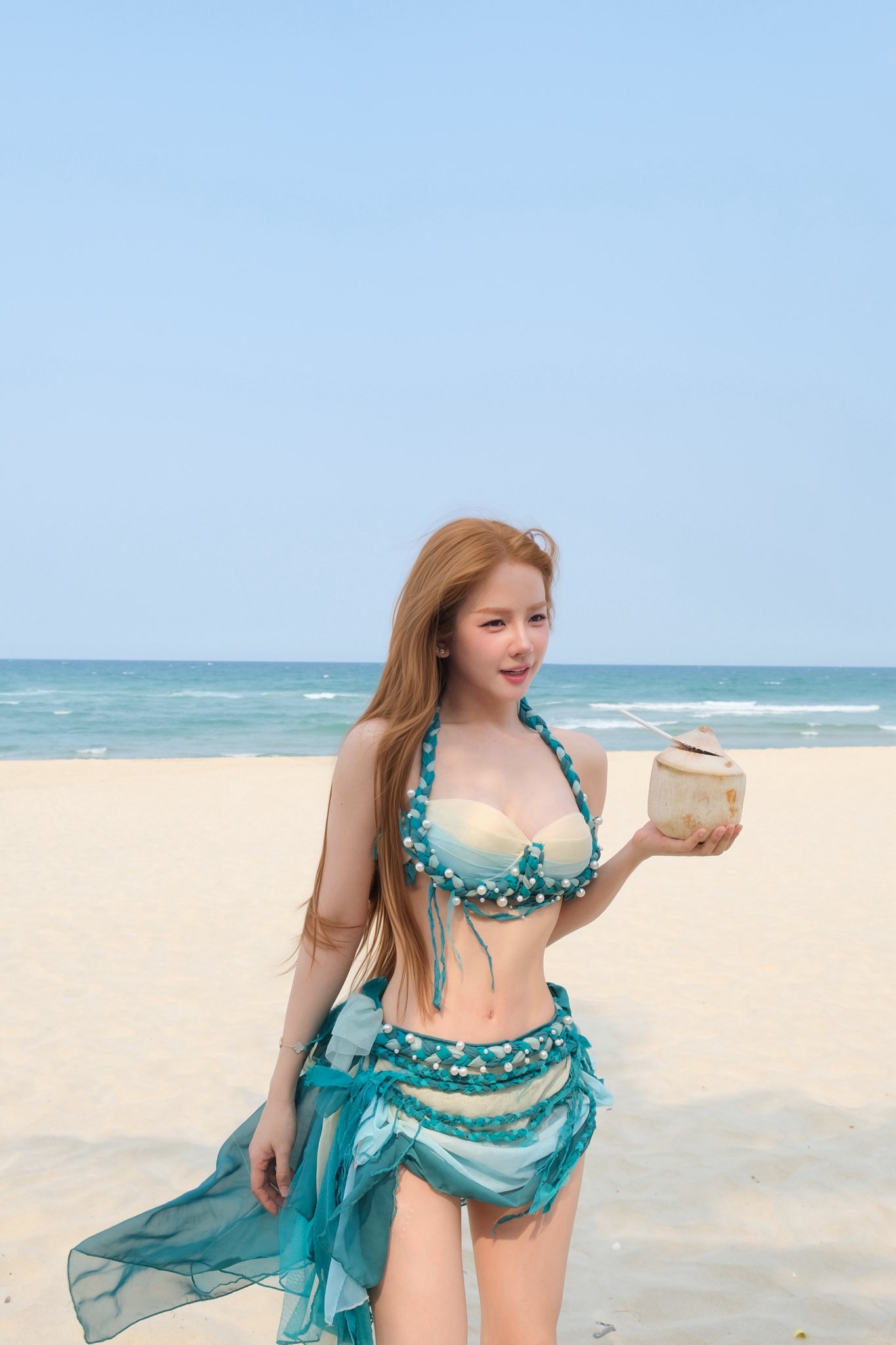 Một trong những mỹ nhân Vbiz chăm đi biển khoe dáng nhất hè năm nay phải kể đến DJ Mie. Cô nàng chọn diện bikini xanh nổi bật, được điểm xuyết chi tiết ngọc trai cùng những lớp voan bay bổng, mang đến tổng thể vừa mềm mại vừa tinh tế.