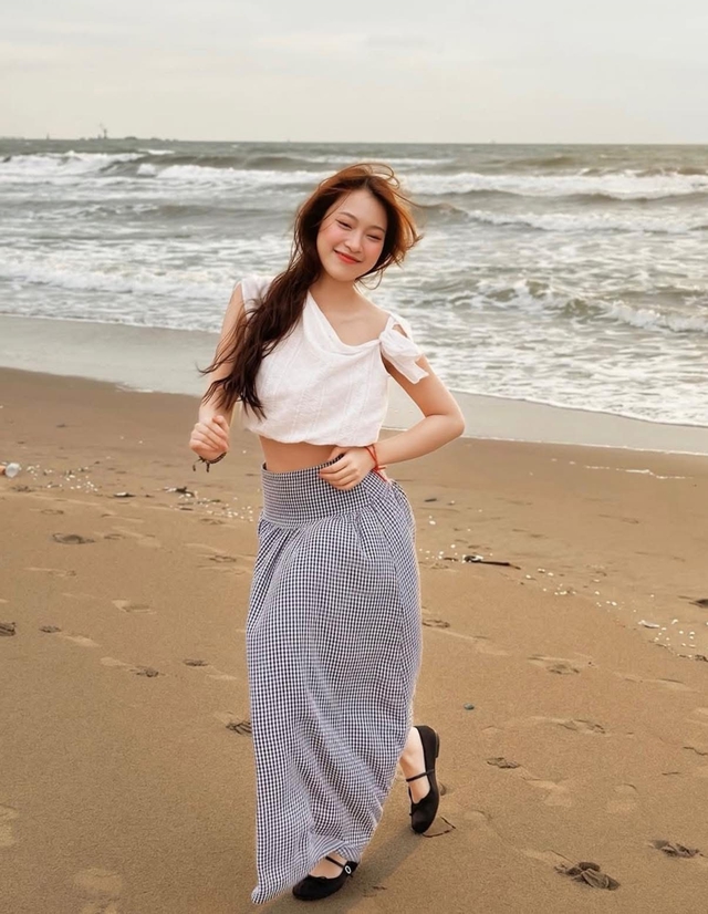 Check-in tại biển Cửa Lò, Khánh Vy chọn diện set đồ siêu xinh với áo lệch vai dáng croptop phối cùng chân váy kẻ và giày búp bê. Outfit điệu đà, bay bổng giúp cô nàng ăn vận đơn giản nhưng đủ nổi bật giữa cảnh biển thơ mộng.