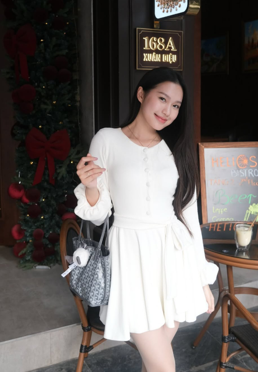 Doãn Hải My từng diện một chiếc váy dệt kim màu trắng kem thanh lịch và được rất nhiều chị em bình luận hỏi xin info. Cũng dễ hiểu vì đây là 1 thiết kế vô cùng nữ tính, dễ ứng dụng dù đi làm đi học hay đi chơi. Thiết kế nổi bật với hàng cúc chạy dọc thân trước, cổ tròn và tay áo bo phồng điệu đà. Điểm nhấn là thắt lưng nơ cùng màu giúp tôn lên vòng eo thon gọn và chân váy xòe nhẹ trẻ trung.