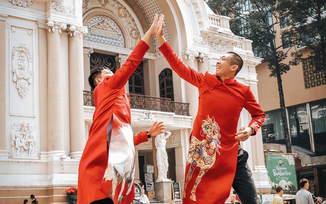 Khác với hình ảnh năng động, quyết liệt trên sân đấu thường thấy, Quang Dương xuất hiện trong bộ áo dài cách tân màu đỏ rực rỡ - màu sắc tượng trưng cho sự may mắn và thịnh vượng. Điểm nhấn trên trang phục là họa tiết rồng và ngựa được thêu tinh xảo, thể hiện sự mạnh mẽ và khí thế trong năm mới.