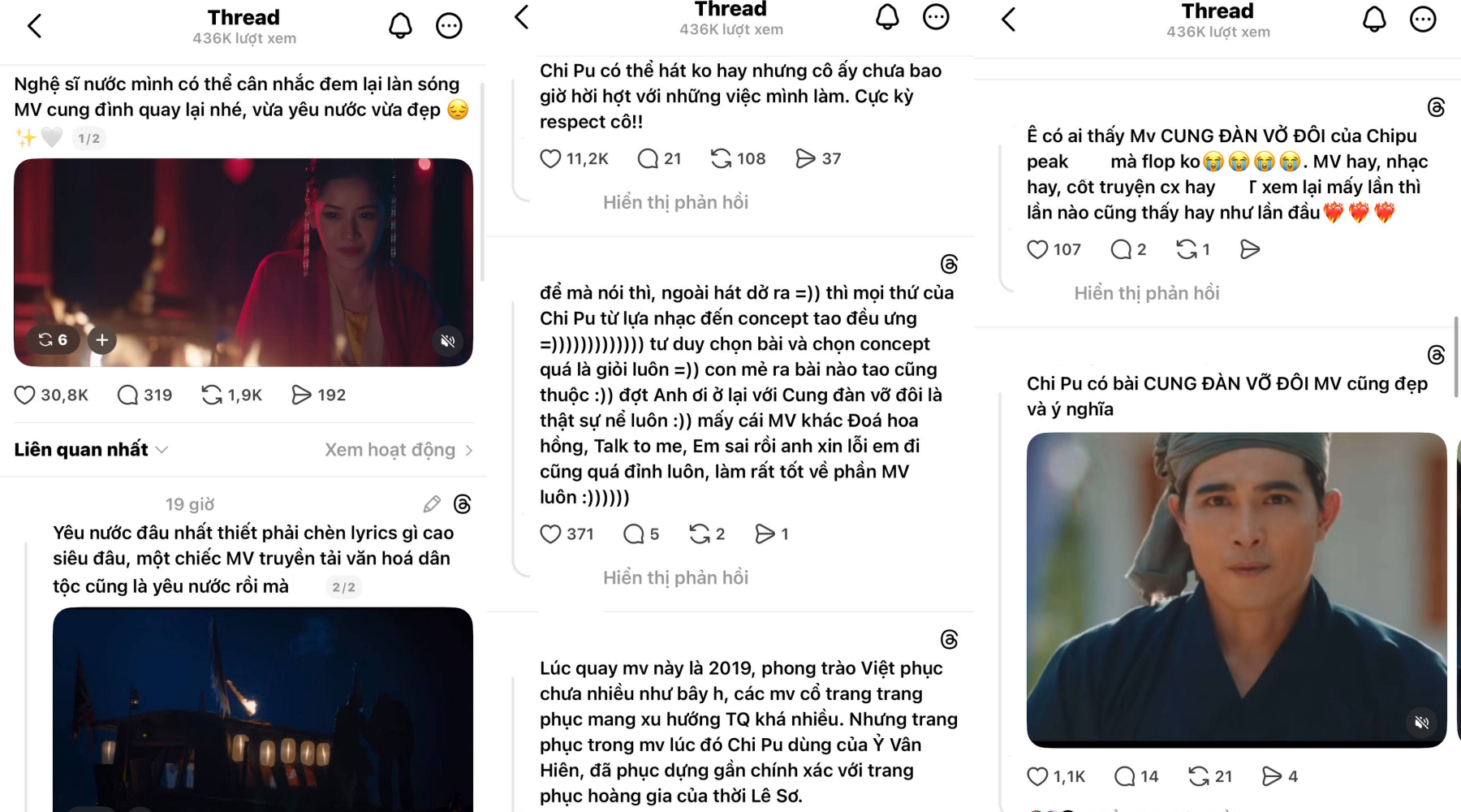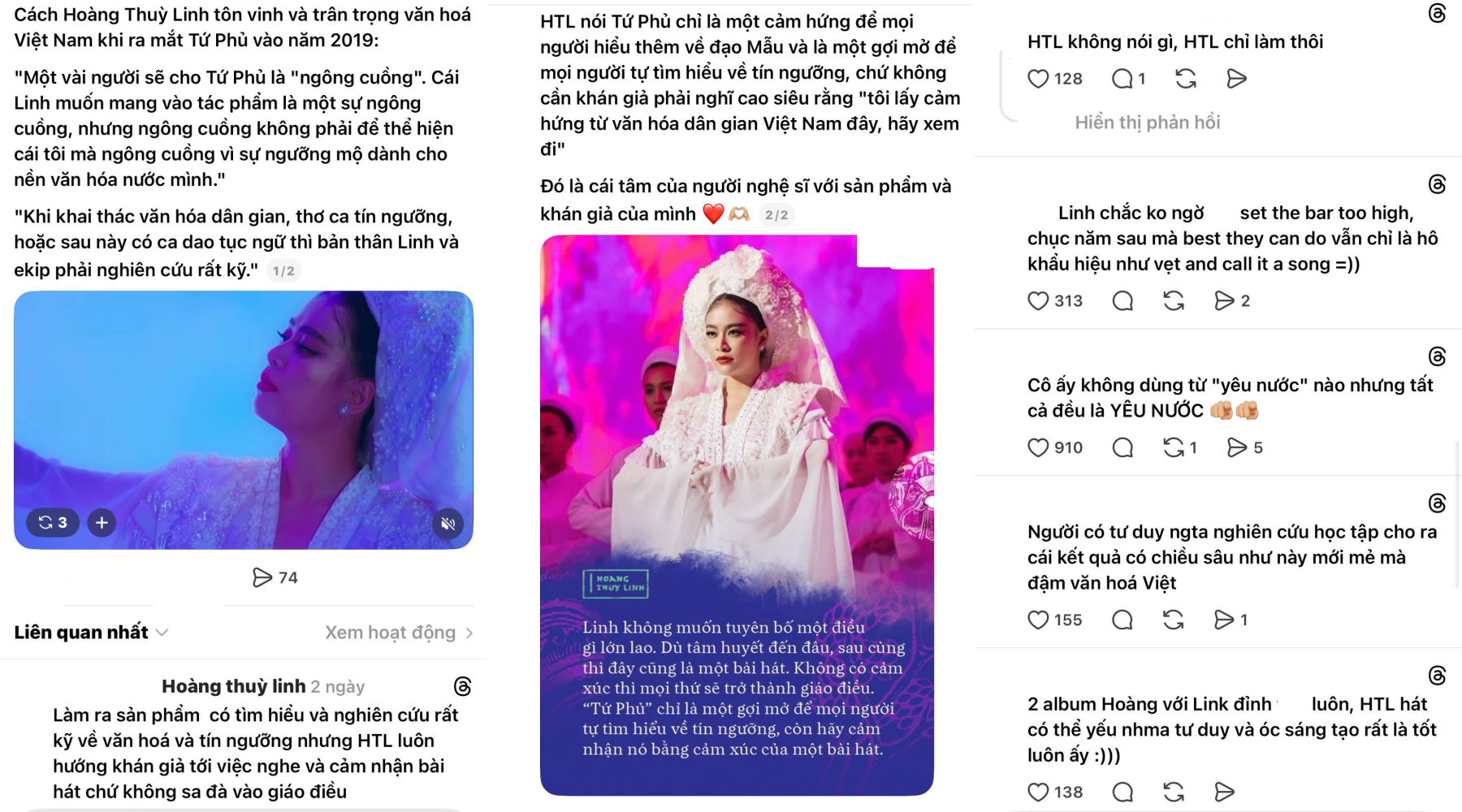 Giữa lúc tranh cãi tiếp tục lan rộng, mạng xã hội xuất hiện làn sóng chia sẻ lại các sản phẩm âm nhạc cũ của Hoàng Thùy Linh, Chi Pu và Phương Mỹ Chi. Đây đều là những nghệ sĩ nữ từng tạo dấu ấn rõ nét với hướng đi đưa văn hóa truyền thống Việt Nam vào âm nhạc đại chúng bằng cách tiếp cận hiện đại, chỉn chu và có chiều sâu.