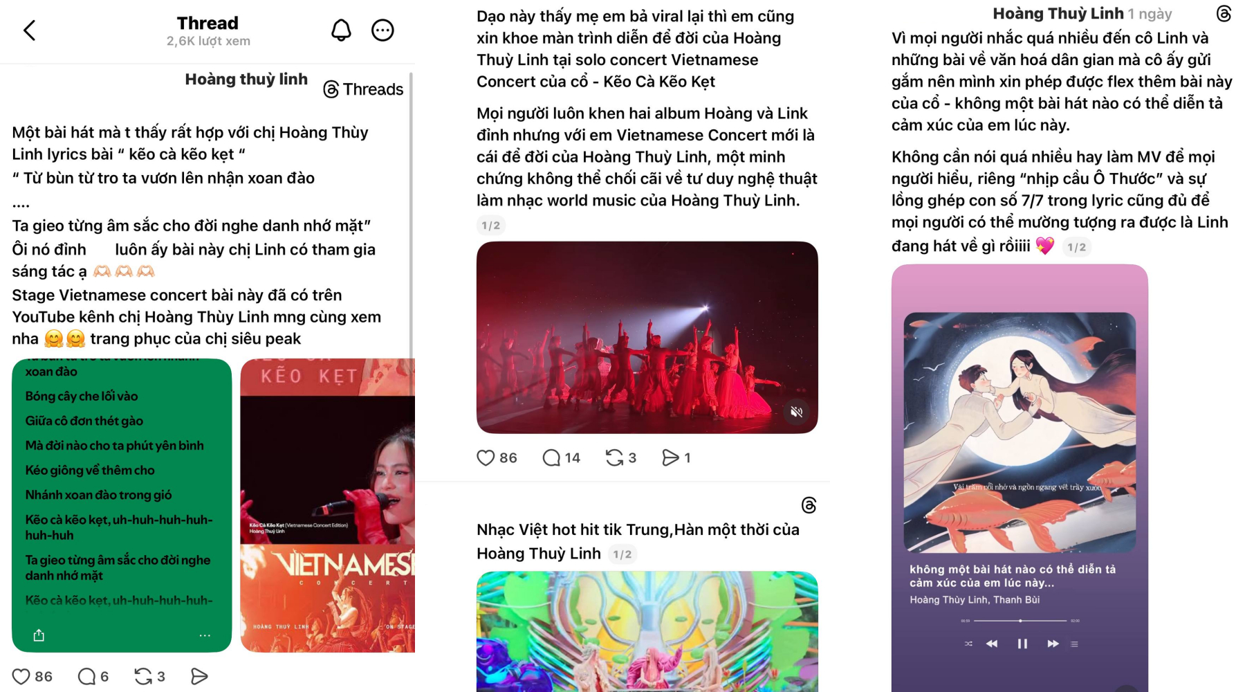 Hoàng Thùy Linh là cái tên được nhắc đến nhiều nhất trong những ngày qua. Trên TikTok, Facebook và Threads, khán giả liên tục chia sẻ lại album HOÀNG, LINK , các sân khấu trong Vietnamese Concert cùng loạt ca khúc nổi bật như Bánh Trôi Nước, Tứ Phủ, Kẽo Cà Kẽo Kẹt, không một bài hát nào có thể diễn tả cảm xúc của em lúc này,...