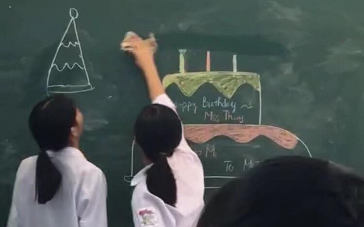 Chiếc bánh sinh nhật kèm các cây nến qua nét phấn vẽ trên bảng được các bạn cùng lớp tặng hẳn sẽ là bữa tiệc sinh nhật không bao giờ quên trong cuộc đời nữ sinh này.