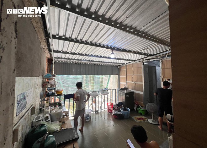 Người quản lý cho biết, căn phòng rộng gần 30m2 được ngăn thành 10 "hộp ngủ", có phòng tắm riêng và ban công được tận dụng làm khu nấu ăn. Hộp ngủ đủ một người nằm, bên trong có bàn gấp. Giá thuê "hộp ngủ" mỗi tháng 1,7 triệu đồng (bao cả điện, nước, gửi xe máy).