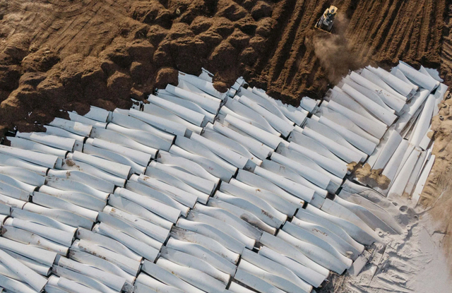 Bắt đầu vào năm 2017, hàng trăm cánh quạt gió "hết đát" dài đến 60 mét, nặng tới 8 tấn được cắt thành 3 phần bằng một chiếc cưa công nghiệp nạm kim cương, xếp chồng lên nhau rồi tập kết tại Sweetwater. Nhìn từ trên cao, chúng giống như những khúc xương trắng khổng lồ.