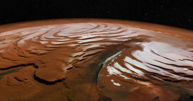 Băng nước tồn tại nhiều ở hai địa cực Sao Hỏa, là nơi mà dấu vết của sự sống cổ đại có thể được lưu giữ rất lâu - Ảnh minh họa: NASA