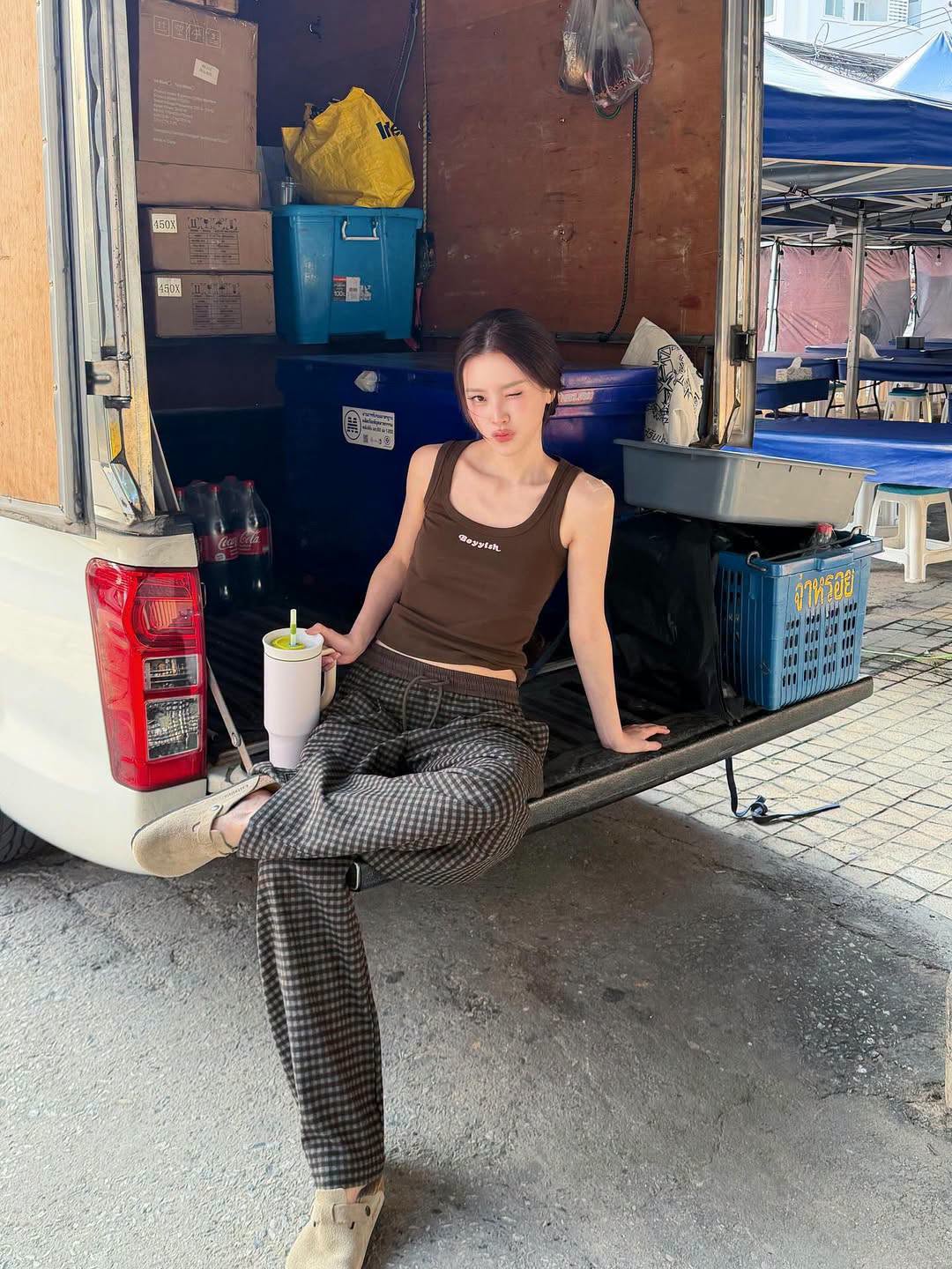 Style hè của Baifern ghi điểm với combo áo 2 dây và quần kẻ vừa đơn giản vừa năng động. Set đồ mang lại cảm giác thoải mái, tươi tắn, diện đi chơi hay cà phê đều hợp vibe. Đây là kiểu outfit nên có trong tủ đồ vì dễ biến tấu, mix cùng nhiều trang phục khác vẫn xinh mà không sợ nhàm chán