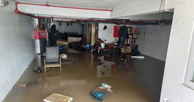 Hầm để xe của tòa nhà ở số nhà 42 Liễu Giai vẫn ngập nước. Ông Nam - bảo vệ tòa nhà cho biết đã sử dụng bơm hút nước cả đêm nhưng vẫn không hết.
