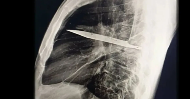 Khi thăm khám, bác sĩ nhận thấy ngực phải của bệnh nhân không nở ra đầy đủ khi hít vào, kèm theo lỗ rò rỉ dịch mủ có mùi hôi. Kết quả chụp X-quang khiến toàn bộ ê-kíp choáng váng: một lưỡi dao lớn gãy nằm gọn trong khoang ngực , kéo dài từ vùng xương bả vai phải đến trước xương sườn.
