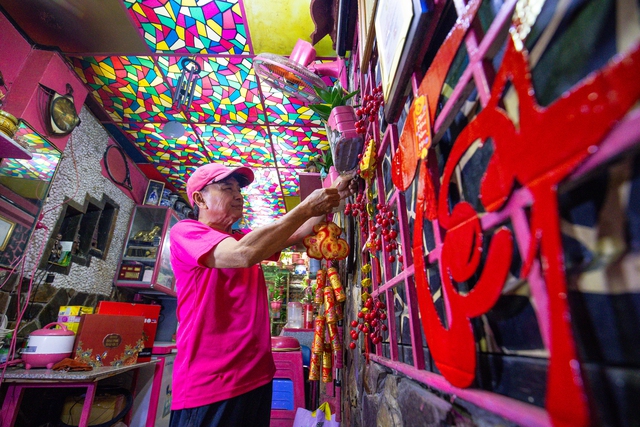 Trong căn nhà nhỏ rộng 53 m2 tràn ngập màu hồng đặc trưng, người đàn ông 70 tuổi mở toang cửa, đi qua đi lại giữa những món đồ tự tay làm. Ngày thường ông tưới cây, làm những vật dụng thủ công màu hồng. Đến Tết, ông treo đặt thêm thêm vài cành hoa, chút đồ trang trí để căn nhà thêm chút rộn ràng của mùa xuân.