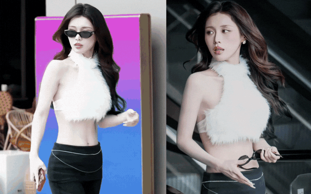 Han Sara chọn cách tiếp cận khá an toàn nhưng hiệu quả: tập trung hoàn toàn vào visual và vóc dáng. Trong đoạn clip theo trend, nữ ca sĩ xuất hiện với chiếc áo croptop lông màu trắng, dáng cổ yếm ôm sát, chất liệu mềm nhẹ tạo hiệu ứng bồng bềnh, tôn trọn phần vai và vòng eo nhỏ gọn. Phối cùng đó là quần đen cạp thấp, thiết kế tối giản nhưng được nhấn nhá bằng phụ kiện mảnh chạy ngang hông, giúp tổng thể thêm phần thời thượng và cá tính. Set đồ tưởng chừng đơn giản nhưng lại phô diễn triệt để lợi thế hình thể mảnh mai cùng làn da trắng sứ của em xinh.