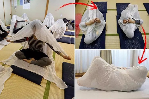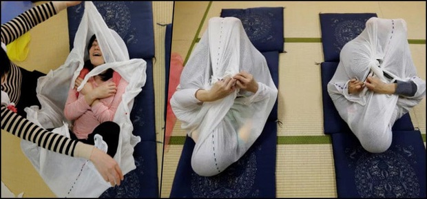 Cái tên nói lên tất cả, đó là phương pháp kỳ lạ mà ở đó, người được trị liệu sẽ nằm vào tấm vải có độ co giãn, người bên ngoài buộc chặt lại. Vậy nên, trông những bức ảnh giống như thể có vụ bạo hành nghiêm trọng xảy ra nhưng thực chất lại là cách chữa bệnh của người Nhật.