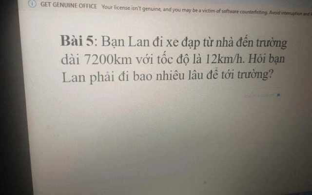 Mới đây, một bài toán tiểu học “gây lú” từng xuất hiện vào năm 2024 trên mạng xã hội bất ngờ được đào lại khiến cư dân mạng tranh luận rôm rả. Nội dung bài toán như sau: “Bạn Lan đi xe đạp từ nhà đến trường quãng đường dài 7.200 km với vận tốc 12 km/h. Hỏi bạn Lan mất bao lâu để đến trường?”.