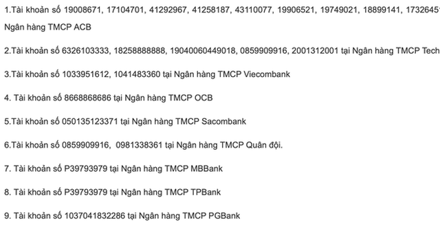 Danh sách số tài khoản ngân hàng các đối tượng sử dụng để lừa đảo chiếm đoạt tài sản: