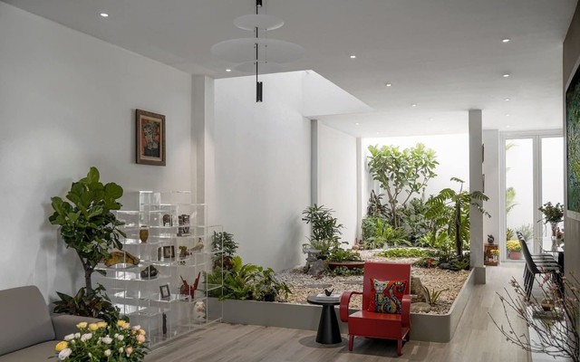 Ở trung tâm tầng trệt là khu vườn nằm giữa nhà, kết nối phòng khách, bếp, sân vườn, đồng thời là “thông khí” giúp trao đổi khí mát nóng giữa trong nhà và môi trường ngoài.